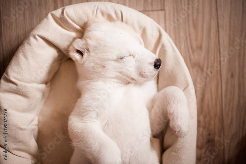 Fototapeta premium Cute alabai baby sleeping in bed on floor closeup. Domestic dog. Top view.