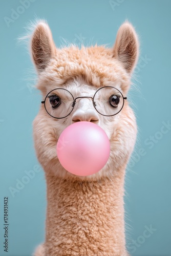 Obraz premium Cute Alpaca Blowing Bubblegum in Glasses Against a Light Blue Background