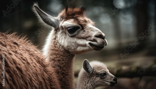 Obraz premium Cute alpaca grazing in green meadow, looking at camera generated by AI