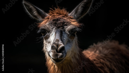 Fototapeta premium Cute alpaca looking at camera in pasture generated by AI