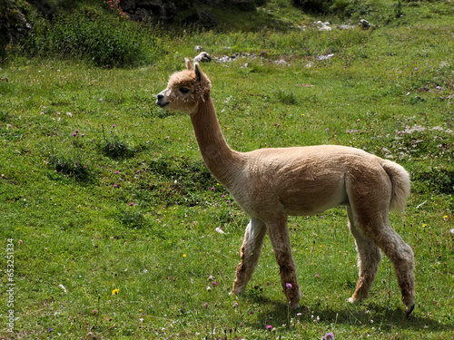 © Izanbar photos, Obraz premium cute alpaca portrait on green grass background in dolomites mountain