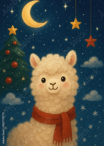 Naklejka premium Cute alpaca under starry sky.