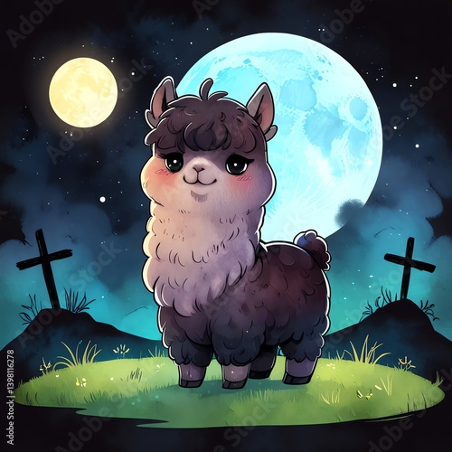 © SetCartoon, Obraz premium Cute Alpaca Under the Moonlight