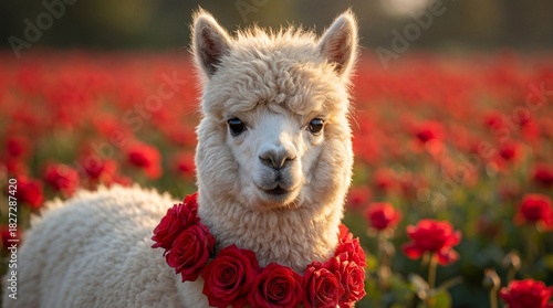 © jockermax3d, Obraz premium Cute alpaca wearing a wreath of red roses in a field of red flowers