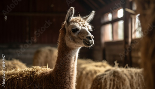 Obraz premium Cute alpaca with fluffy fleece smiling for camera generated by AI