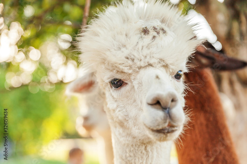 Obraz premium Cute alpaca with funny face relaxing on ranch in summer day. Domestic alpacas...