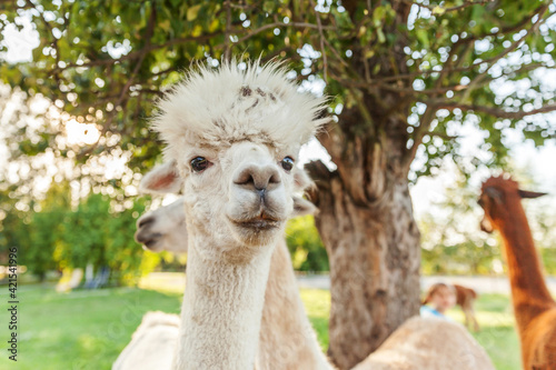 © Юлия Завалишина, Obraz premium Cute alpaca with funny face relaxing on ranch in summer day. Domestic alpacas grazing on pasture in natural eco farm countryside background. Animal care and ecological farming concept