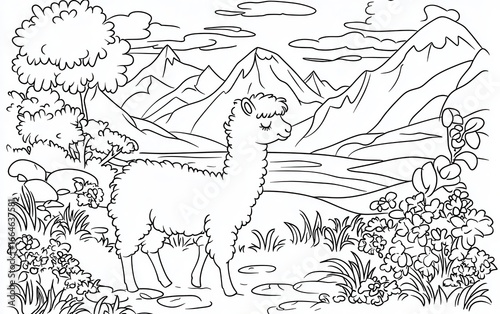 Fototapeta premium Cute alpacas in the mountains coloring book page, featuring fluffy alpacas...