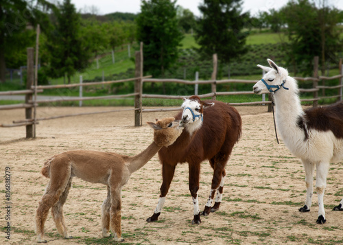 © Yuliya, Obraz premium Cute Alpacas on the farm. Beautifull and funny animals
