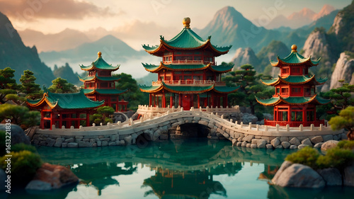 © Rodrigo, Naklejka premium Cute ancient China scene with pagodas and bonsais on a round platform. Red, jade and gold tones in a clean kawaii 3D style.