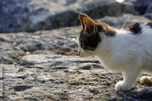 Fototapeta premium Cute and beautiful kitten walking alone on rocks- Side view