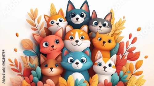 © khonkangrua, Naklejka premium Cute and Colorful Cartoon Cats Surrounded by Leaves