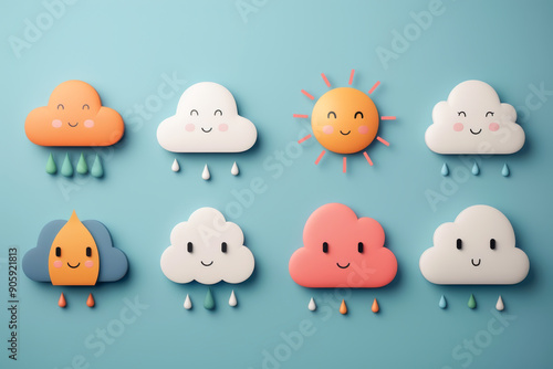 Fototapeta premium Cute and colorful weather icons featuring smiling clouds, raindrops, and a cheerful sun, perfect for kids' designs.
