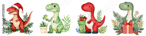 Naklejka premium Cute and festive dinosaurs in holiday attire, celebrating with gifts and greenery, perfect for cheerful seasonal designs.