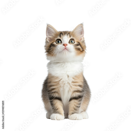 © Chanthakan, Obraz premium Cute and fluffy kitten sitting upright and gazing inquisitively at the its soft fur round eyes and alert expression
