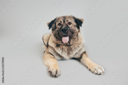 © belyaaa, Obraz premium Cute and funny Caucasian Shepherd dog posing for the camera in a studio