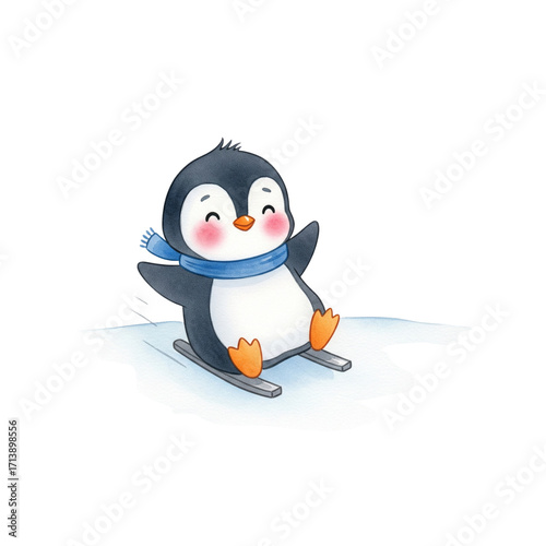 © yapayong, Obraz premium Cute and funny penguin on the snow with ice skates and a snowman, celebrating a happy winter holiday