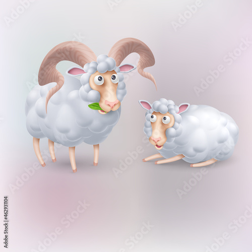 © Dvarg, Obraz premium Cute and Funny white Sheep Characters. Cartoon Illustration of Pair Sheep. Perfect Template for Children Event Designs, or Birthday Cards