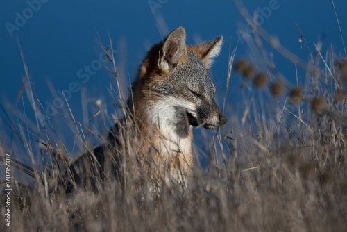 © motionshooter, Fototapeta premium Cute and furry Island Fox lounging in the tall grass and looking to the left while soaking up the morning sun and foraging for food
