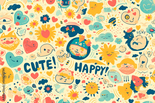 Fototapeta premium Cute and happy themed pattern with various smiling characters, hearts, and whimsical elements in soft pastel colors.
