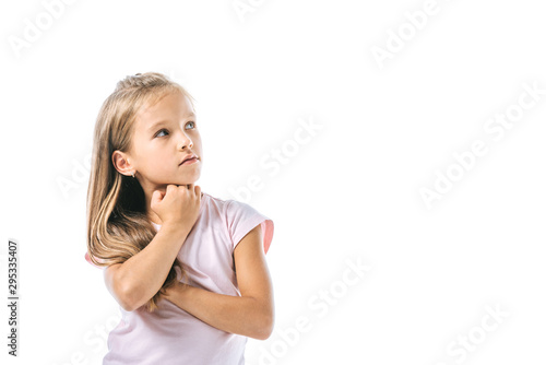 © LIGHTFIELD STUDIOS, Fototapeta premium cute and pensive kid touching face and looking away isolated on white