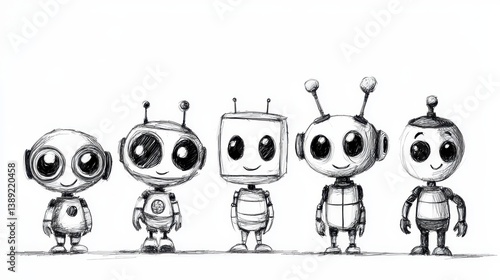 © ประดิษฐ สิทธิศักดิ์, Obraz premium Cute and Playful Cartoon Robots in a Line Drawing Style