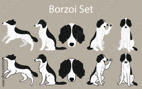 Obraz premium Cute and simple black and white Borzoi illustrations set