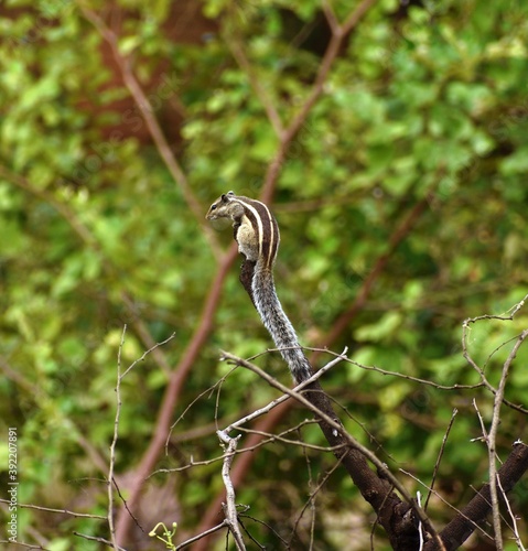 © Sudhakar, Fototapeta premium Cute and young Squirrel standing upright on a branch