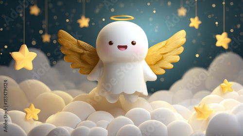 © Atchariya63, Obraz premium Cute angel character with golden wings and halo floating among soft clouds and glowing stars in dreamy night sky