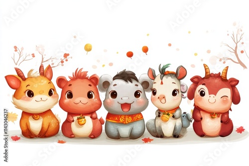© Bojan, Naklejka premium Cute animal characters celebrate Chinese New Year with cheerful expressions and decorations