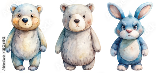 Fototapeta premium Cute animal characters, watercolor style, playful design, children's illustration, friendly bear and rabbit.