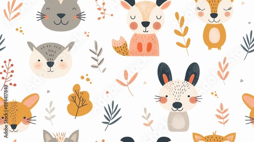 Fototapeta premium Cute animal faces and leaves pattern on a white background. Whimsical and...