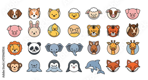 Obraz premium Cute animal faces cartoon set collection of vector illustrations of various animal heads, including dog, cat, sheep, pig, tiger, lion, panda, elephant, giraffe, monkey, penguin, dolphin, and fox