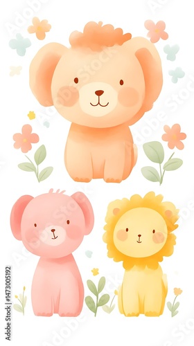 Obraz premium Cute Animal Illustration Dog Elephant Lion Flowers