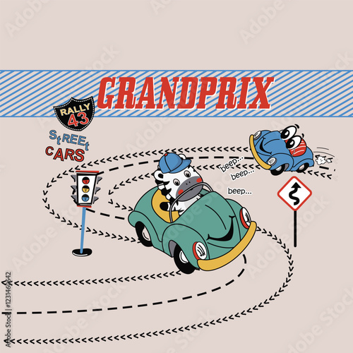Fototapeta premium Cute animal vector illustration racing at high speed in a thrilling car race, fast and dynamic