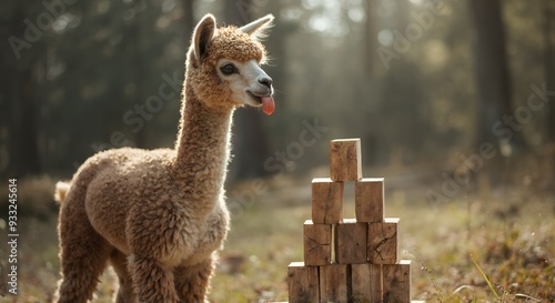 © Necomimi, Obraz premium Cute animal wallpaper collection, Curious alpaca's wooden puzzle, Playful camelid explores forest blocks, showcasing animal intelligence and natural inquisitiveness