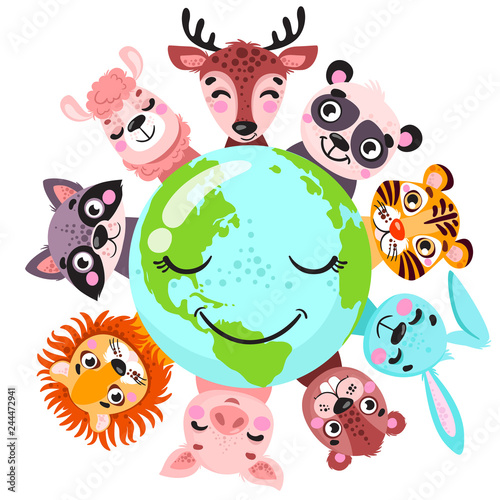 © anhut, Naklejka premium Cute animals around globe banner vector illustration. Animals planet concept, world continents fauna, world map with wild animals. Panda, lion, raccoon, deer, pig, llama, hare, tiger in cartoon style