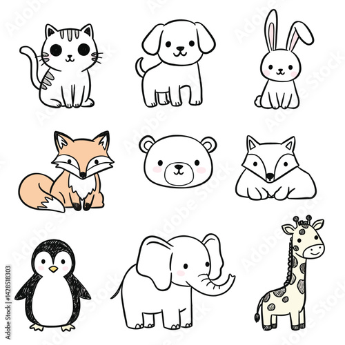 Obraz premium Cute animals collection with cat dog rabbit fox bear penguin elephant giraffe in simple vector style