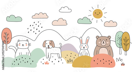 Fototapeta premium Cute Animals in a Landscape, Whimsical Illustration