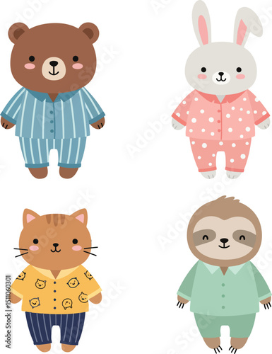 Fototapeta premium Cute animals in colorful pajamas bear rabbit cat sloth in cartoon style vector illustration