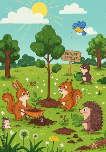 Fototapeta premium Cute Animals Planting Trees: Adorable cartoon animals—squirrels, rabbits, and hedgehogs—collaboratively plant saplings in a vibrant, sun-drenched meadow, fostering a future forest.