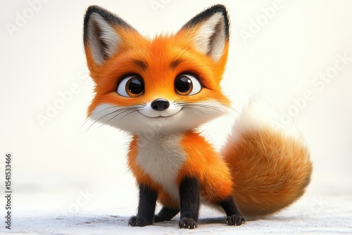 © Tanu, Fototapeta premium Cute animated fox character with bright orange fur standing on a light background
