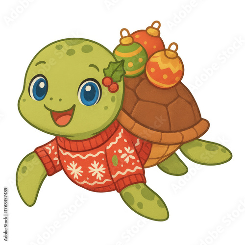 Fototapeta premium Cute anime turtle in festive sweater with Christmas ornaments on shell....