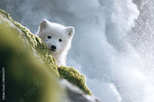 © SolaruS, Fototapeta premium Cute arctic fox pup curiously peeks out from behind mossy rocks, against a blurred, ethereal waterfall backdrop. Represents innocence, wildlife, and arctic nature.