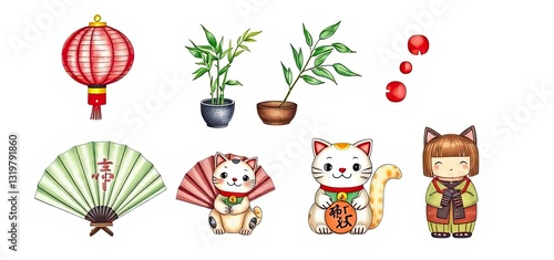 © Ahingska, Fototapeta premium Cute Asian New Year Cats Lantern Fan Plants