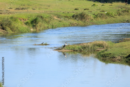 Fototapeta premium Cute Asian openbill or Asian openbill stork bird (Anastomus oscitans) on the river bank in Nepal