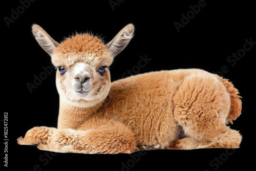 © abdul, Naklejka premium Cute baby alpaca lying down on a black background