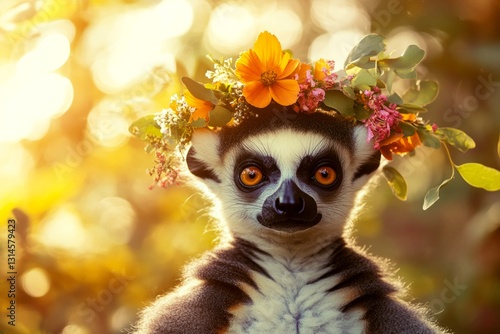© A, Naklejka premium Cute baby animal lemur wearing primal flower wreath on its head. Summer happiness. Early sunshine. Animal with floral elegance. Elegant wildlife with floral accents. Sun-kissed wild animal.