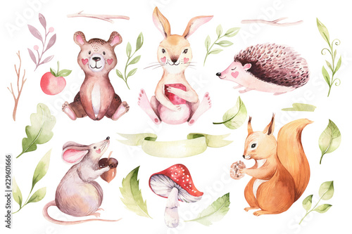 Naklejka premium Cute baby animal nursery mouse, rabbit and bear isolated illustration for children. Watercolor boho forest drawing squirrel, watercolour, hedgehog image Perfect for nursery posters, patterns