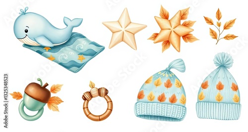 © Ahingska, Naklejka premium Cute Baby Boy Autumn Winter Clipart Set Whale Hats Leaves